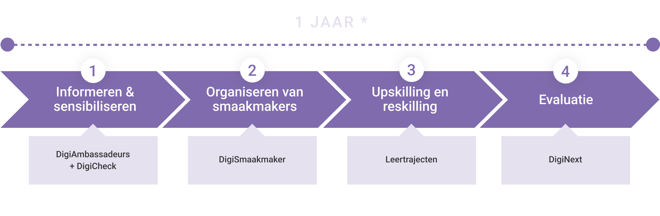 * Gemiddeld heeft het project een doorlooptijd van 1 jaar. Natuurlijk kan dit sneller of langer duren afhankelijk van de projectvraag, het aantal werknemers/afdelingen of de interne organisatiestructuur.